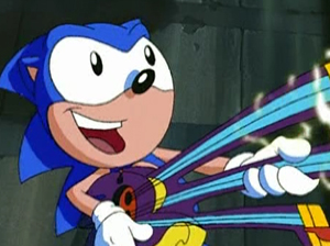 Appearances- All Bio- Born the oldest of 3 triples to Queen Aleena. When they were young, the Queen found out that Robotnik would take control and feared for the safety of her Children. She have to give up the kids and wait for the right time to beat Robotnik. Sonic was taken to a woodsman on his wife. There he grow up learning to play the guitar, Eat Chilly dogs and to control his speed. A while later, Robotnik came looking and The woodsman had to take Sonic to see a Hedgehog friend of these to look after Him. This Friend was Charles Hedgehog. Sonic spent the rest of his time with his Uncle Chuck and fought with him in as part of the Freedom Fighters. A While Later After meeting up with his Long lost Sister and Brother, Sonic found out that Robotnik Robotised Uncle Chuck. Sound Clips- ![]() Notes Relating to the Character- * While there is no Official Statement on it, it does appear that Sonic was the First born. |