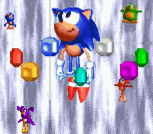 it's a bit of a pain, but even emeralds from the same set seam to change colour from game to game. This isn't something that can be explain via some fancy story really (well, not one that would stand up) so let's just say it is due to limits in colours and research mistakes. Should I talk about Emerald wannabes? well.. not really, but here is a little bit. In order to change bits and at the same time, make the story better, the Chaos Emeralds were changed into the 'Time Stones' for Sonic CD. They were the same kind of things, and yet again, Robotnik was going after them to rule the world, but this time there power wasn't to power weapons, but travel though time. In Choatix, there are the Chaos Rings. Colour wise, they are the same and the share the 'Chaos' name. However, this aren't quite explained as well as the Chaos Emeralds.