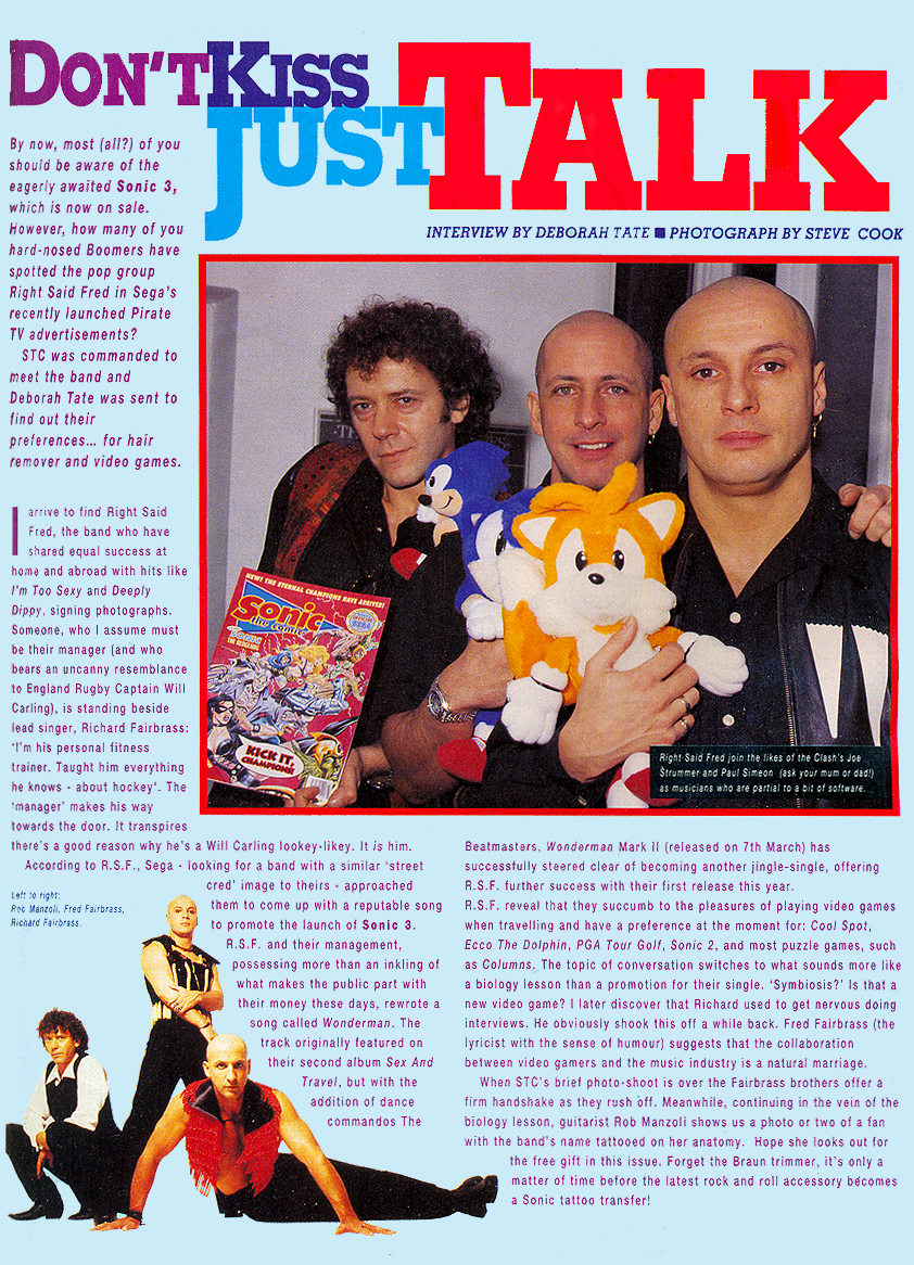 The track originally featured on their second album Sex And Travel, but with the addition of dance commandos The Beatmasters, Wonderman Mark II (released on 7th March) has successfully steered clear of becoming another jingle-single, offering R.S.F. further success with their first release this year. R.S.F. reveal that they succumb to the pleasures of playing video games when travelling and have a preference at the momment for: Cool spot, Ecco The Dolphin, PGA Tour Golf, Sonic 2, and most puzzle games, such as Columns.