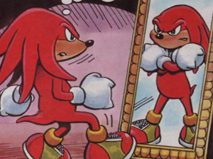 When Knuckles found an old Mirror, his reflection seams to come alive an step out of the mirror. Knuckles found it it was an evil spirit that had been trapped in the mirror and taken his Form. Knuckles then trapped the Spirit back in the Mirror and then Destoried it. |