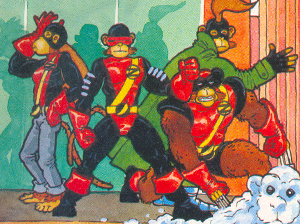 Cycleclips, Grey Jeans, Armpit, Chimpoline and Snow Monkey are the Zed Monkeys! Superhero protectors of the Mootant village section of New Tek City. Only problem is there powers aren't very good and there superhero beliefs mean when they turn up they stand around talking and then at ten o'clock have Hero Hour! A whole hour of posing, even if they are meant to be fighting crime at the time. In there end, there Leader, Professor Zed turned out to be a baddie and they turned Hero Hour into Agony Hour where they feel sorry for themselves for the whole hour. |