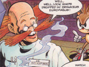Dr Ovi Kintobor was an Old-ish Scientist that wanted to trap all the evil of Mobuis into Seven Emeralds. One day as he was working in his Lab when a Brown Sonic appeared. Sonic agreed to help the Doctor in his work and when he was testing the Doctors 'Power Sneakers' he broke the machine and turned Blue. After working for a while, they got Hungry and the Doctor went to get something to eat but all he had was an old egg. He went to freshen it up when he tripped over a wire and fell into this ROCC (Retro Orbital Chaos Compressor) machine and all the Evil he was trying to Store in the Emeralds went into him, this mixing with the egg created Dr Ivo Robotnik (renamed after the letters on his name tag changed). Some point, Kintobor made a Hologram of himself to make his computer easier to use (See Kintobor Computer). The Next Time Kintobor Appear, we found out that Sonic HAD to go back in time and trip up Kintobor to make Robotnik, to stop a great evil from taking over Mobuis. Kintobor next appeared when Sonic was going after Robotnik to the Atom sized world of Shanzar, where he found that Robotnik had somehow turned back into Kintobor BUT he appeared to need to take medicine in order to stay as Kintobor. When on a mission with Sonic, he wasn't able to take it in time and turned back into Robotnik.