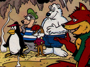 Guntiver the fox, Augustus the Polar, Sealia the Sealion, Erma the (Fox?) & The Penguin are a group of displaced Arctic animals that helped the Freedom Fighters when they helped them and ended up forming there own Freedom Fighter group in the Arctic zone. |