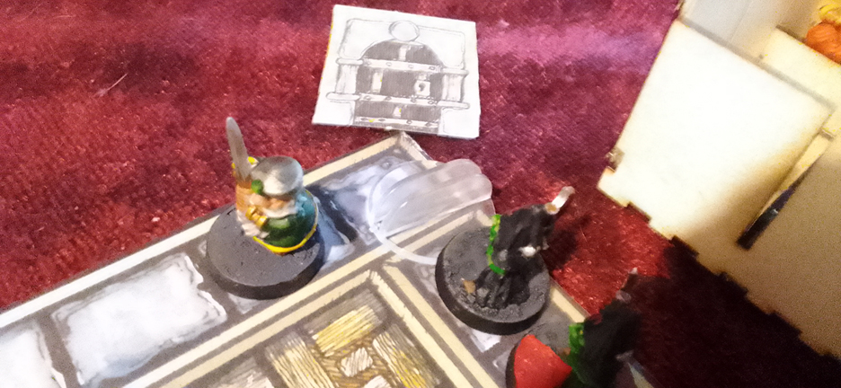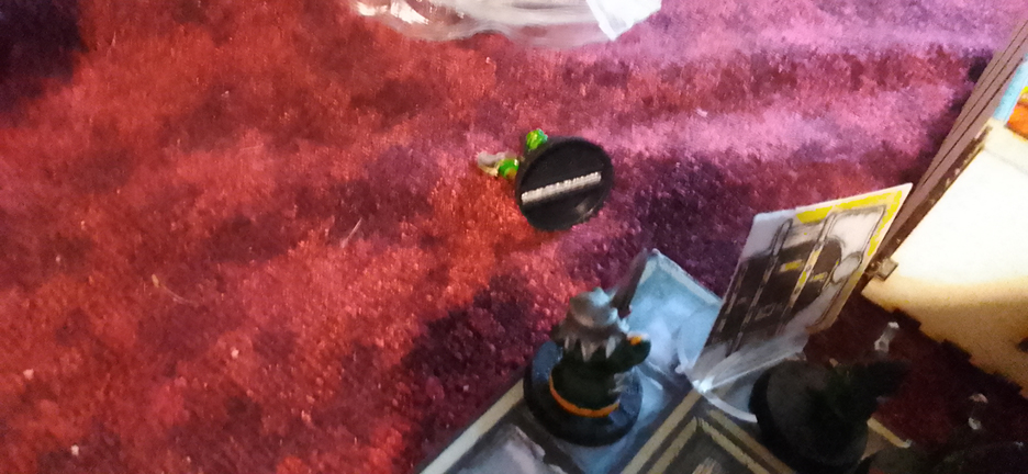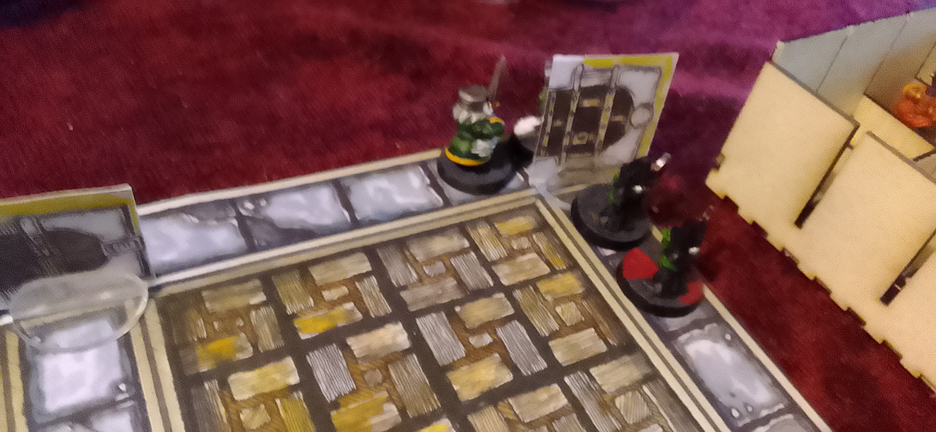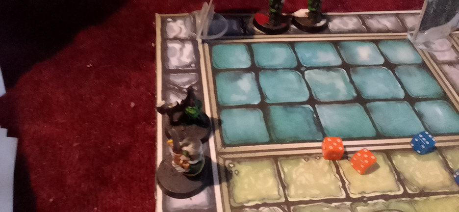 however, his happiness was short lived as Numba 2 was already and waiting next to the now locked door, and attacked it with the full might of his axe.. rolling a total of 19.. with a 12 being all that was needed to smash that door. Oh well, there goes the door, and Numba 3 was able to move passed his mate and take a swing at David. David only had his base defence of 3 dice but was able to stand up to the goblin, who was only able to kick him up the arse and jolt him forward one, which ultimately helped him in the right direction.