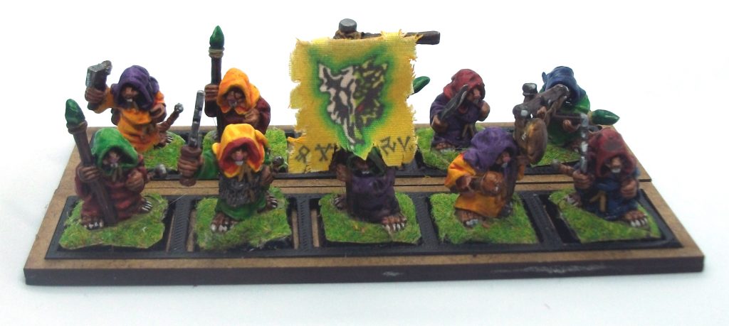 This is my first unit of plague Monks. 10 monks in a 5×5 arrangement with one having a standard. The figures are from Little Solder’s “Ratlings and Vermin” figures which I had on pre-order. They are a bit smaller then normal skaven plague monks but the robes really work well for plague monks. While some of them have spears, I just class that as hand weapons (made to look like Warpstone tips). I have given them Light armour (stat wise) and includes a standard and a musican, both of which course twice the price. So it’s 6pts + 2 for light armour, then the double for them specials, making it a 96 point unit.