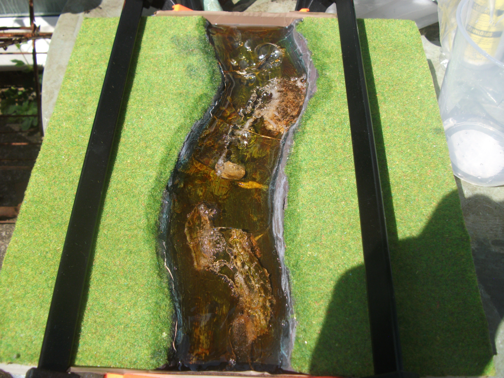 It turned out, the day in May was a bit warmer then I thought it was. Thus the resin set much too quickly and did what is called ‘burning’. It went yellowy, it formed cracks and started to shrink a bit which caused some damage to the edges of the river bank.