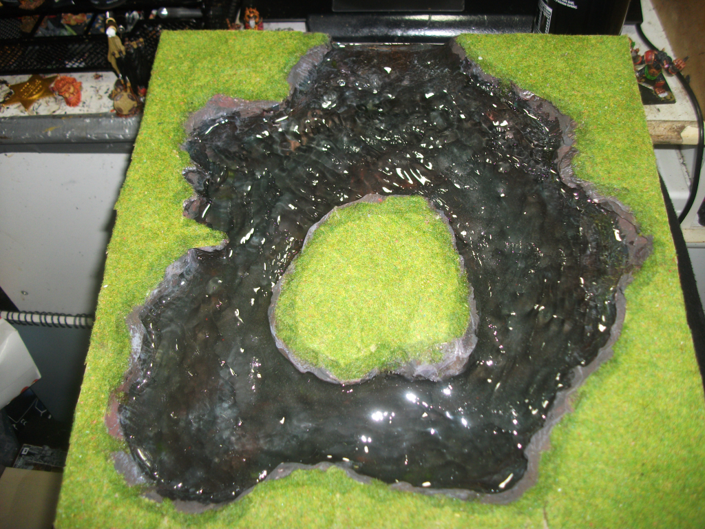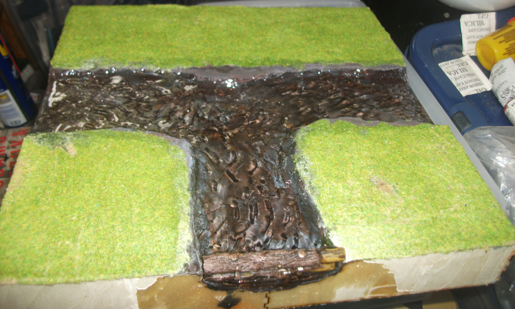 So, this board was screwed.. however, I think I might be able to kinda save it by just making it into a slightly dirty river section, so some patching on the river bank and some weeds/plants to cover up bits.. however, trying to get that right hasn’t been done yet and every thing I’ve looked at to try hasn’t worked so.. nothing yet. Oh, and there are also some small bubbles where it hasn’t fully degassed cause it dried too quickly. Like I said, can probebly do a patch job but so far nothing. I kinda want to do more river section tiles in the future so I have more of a range (and even some non-river tiles so I can have a 3×3 tile setup without rivers if I want) but sometime. not now.