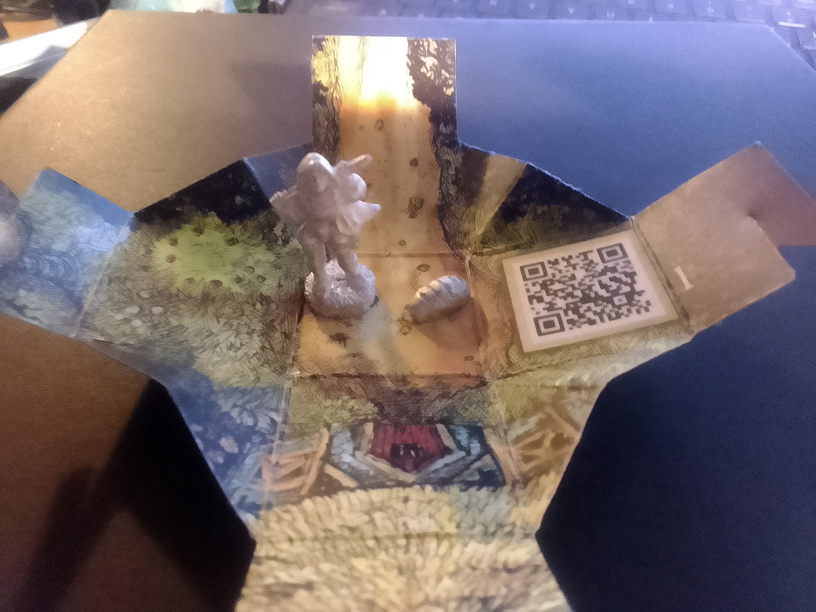 This years was a more mm.. roleplay? maybe, officially they call it a ’tile exploration game’ which is a Solo game where you have 24 lead-pewter miniatures, three dice, five stat cards, reference card, and other stuff. Each day you have a little parcel to open which has the miniature, the box for that day becomes that days tile on the gaming board and then the rules for that day.