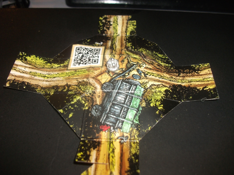 Red comes across a large overturned cart which has been there for some time. She decided to search it and with her perception of 3, she rolls.. a 3 which means she has seen something half buried. It is a golden crown, Just like the Ghost wanted! Well.. I might as well take that with me. As it’s another cross roads, that gives me 3 directions I can head in. I think I’ll pick East, kinda randomly.