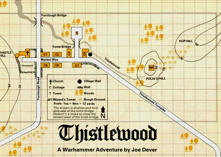 Thistlewood starts off with a nice little map of the general area and looking at it from a 3-4ed view (more 4ed then 3ed but I’m easy both ways), you can see how much the original system was just that. a System. While there was some ‘world of warhammer’, it wasn’t a HUGE HUGE thing. The Scenario was written for 2,4 or 6 players (aww… only multiples of 2..) with a umpire, cause like with alot of things, early days an umpire was something that kinda required while later it became ‘optional but best’. The field was to be 8 by 4 feet (which he points out it’s the size of an average table-tennis table.. useful to know for anyone that goes to a youth club at the time and surely something which is intentional. It also points out it can be scaled but try to keep everything in roughly the same places. They also recommend that when fighting goes into buildings, use the Dungeon Floorplans in a small area away from the main table. Wow, I must say the idea of taking the action to a ‘sub board’ like that.. isn’t something I’ve seen done alot. Though it highly reminds of me of how old RPG games are made. Outside you would have the building but when you enter the door, you are warped to a inside map where the building is most likely bigger then the outside cause you have different reasons and limits so you can explore it in more detail. It then goes into some minor details on positioning and stuff.