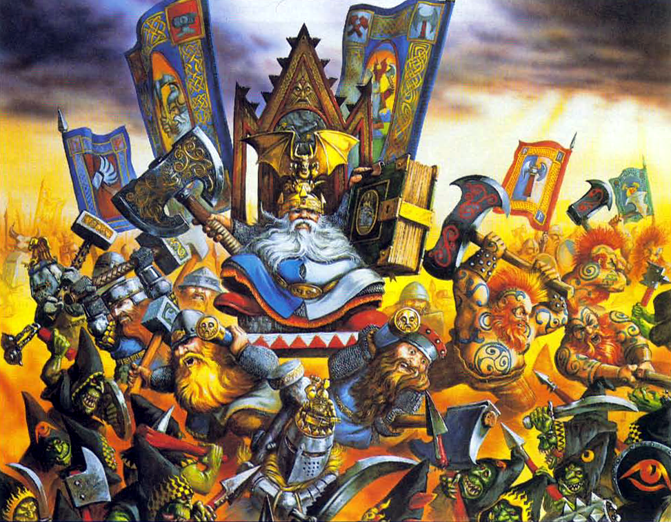Oh, by the way, I’m not up on my Dwarves so I decided to have a flip through 4ed Armies book of Dwarves to see if they did anything with this guy cause it would be a nice reference if they did. As I’m sure anyone more up on their Dwarves would know, They did. Thorgrim became the Dwarf King of Karaz-a-Karak. He is known as the Grudge Bearer because of his copy of the Book of Grudges he has with him at all times (Dammaz Kron). He rides the Throne of Power, an ancient Dwarf relic. He gives up on the Ancient and powerful Warhammer (THE warhammer at the time? no clue) in exchange for the Axe of Grimnir, and replaces his Mithril armour for a special Skaldour’s Armour. Oh and gains the Dragon Crown. He can be fielded off the throne if you want. and Looking at his stat line.. he shows his age. A bit stronger, bit better ballistic skill, can make an extra attack but is slower (3 instead of 4) and his skill with weapons has gone down. Toughness? like I said, they replaced the Letter system with numbers so… pass. but all in all, I think the two characters are clearly related.